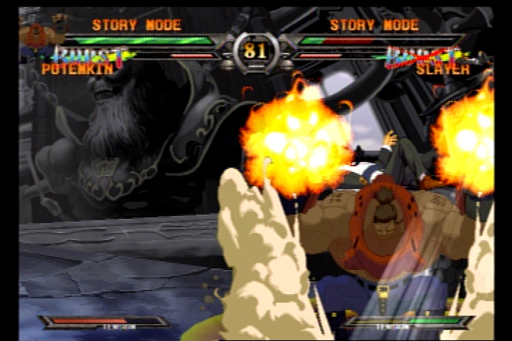 The basic structure of Guilty Gear X2 hasn’t strayed far from Guilty Gear X. You have four main attack buttons (Punch, Kick, Slash, Hard Slash) as well as a new button called Dust Attack which allows you to launch your opponent high into the air for air combos. Other new features include Burst Attacks, which allow you to escape tight situations and combos, a Just Defense system similar to Garou: Mark of the Wolves and False Roman Cancels. Similar in execution to the original Roman Cancels in GGX, False Roman Cancels allow you to cancel the recovery on a limited number of moves so you can continue your assault or to block an incoming counterattack after your initial barrage had missed. Guilty Gear fans neednt worry, for old favourites such as Dead Angle Attacks, Gatling Combos and Roman Cancels are still in the game.