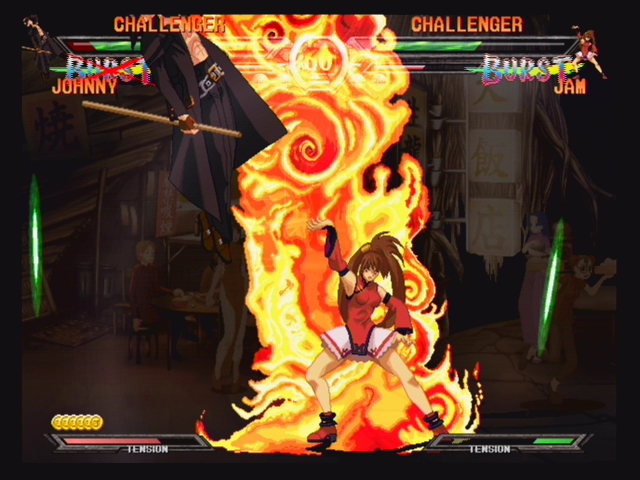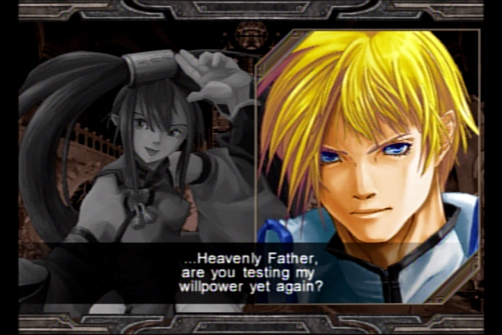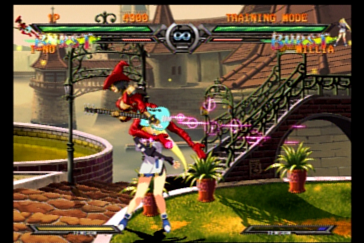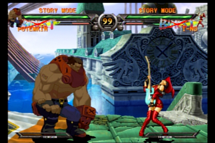 Based on the arcade game Guilty Gear XX (cue Guilty Gear XXX joke here), GGX2 is an incredibly accurate translation that adds more modes, new characters and a whole bunch of secrets to unlock as you go along. GGX2 retains the original Arcade, Versus, Training, Survival and Medal modes from the first game and adds two new modes: Story and Mission mode. Story mode starts off with a statistical rundown of your character that’s taken from the Bureau’s database, and then gives you a debriefing on their background and powers, rating them on a scale of how dangerous they are. You then enter your character’s role as you progress through the entire story of Guilty Gear X2, with muiltiple branches depending on the character you’ve chosen. The Story mode isn’t just a carbon clone of the Arcade mode with a few lines of text thrown in either; it contains some quality voice acting (voices in Japanese with English subtitles) and various scenarios that will leave your fighter at an advantage or a disadvantage before the fight even begins.