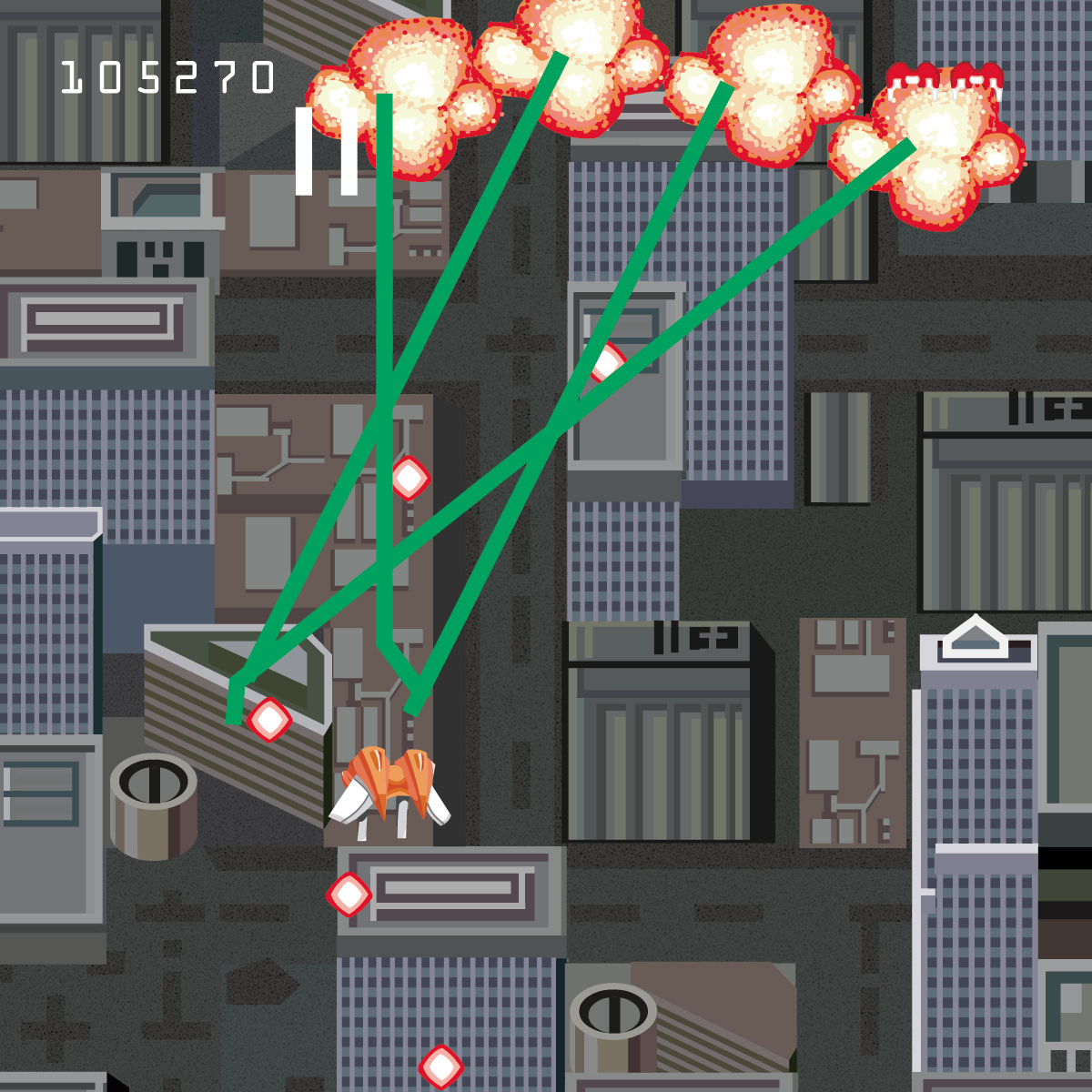 The action unfolds over five levels of swarming, bullet-spitting enemy turf, ranging from a crowded cityscape to an armada-patrolled stretch of space. The backgrounds and enemies are noticeably diverse, and true to the genre, each level culminates in a boss encounter.