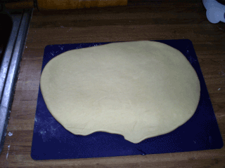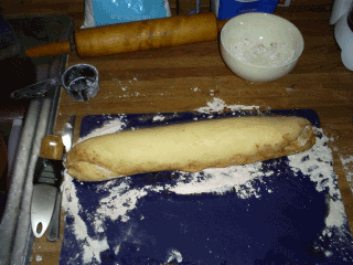 After it's rolled out you sprinkle some cinnamon and sugar down on the top of the dough. After that you roll it up into a little sticky bunz log.