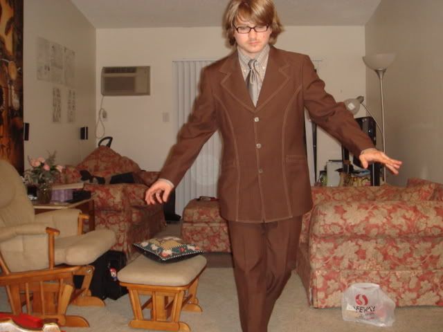 Me being fantastic! i found that suit at Good Will. It was as if someone had bought it in 1974, stored it in a time capsule, brought it out of the time capsule yesterday and said, "Who would want this shit?" as i walked into the store and said, "Who would ever get rid of this fantastic suit?"