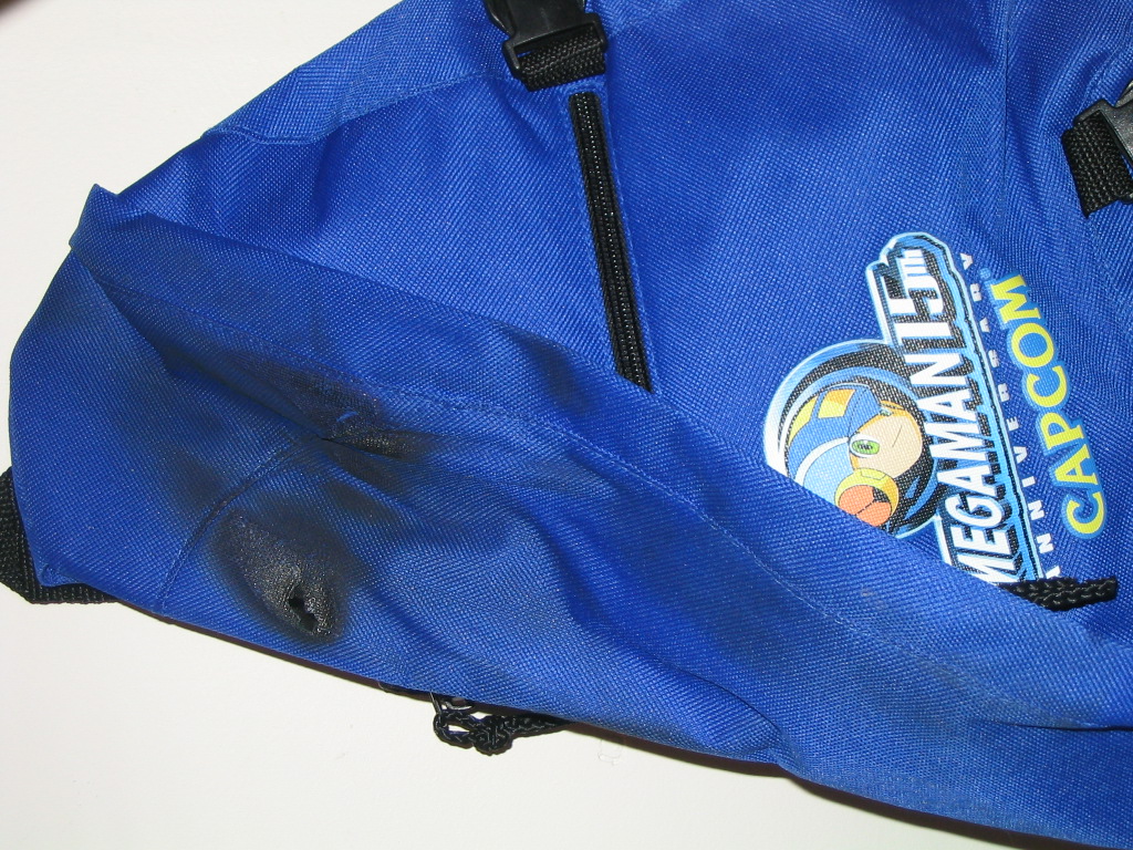 And finally, the sad fate of the Megaman backpack. If there's women or children around I'd advise them to look away, lest they be scarred by the horrors unleashed this day-