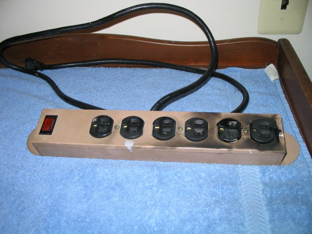 The second to last outlet on the right was where it was plugged in. Notice how you can't see any holes to plug things into? Care to guess what's blocking them off? Yep, it's the plug from the charger, melted into the power strip.
