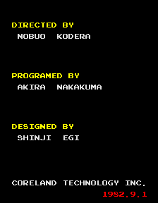And I forgot to include Jump Bug in this thread which had a Hoei release and an Arcadia 2001 port which copyrights Coreland. CRV showed me that there is an Alpha Denshi version of Jump Bug so they might be the original developer. I'm still confused about that.